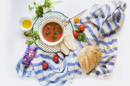 Geben Sie die Suppe in eine schöne Terrine und garnieren Sie sie mit frisch geschnittener Petersilie und ein paar Basilikumblättern. Nach Belieben können Sie in einer Pfanne Butter zergehen lassen und zwei Scheiben klein gewürfelten Dinkel-Toast darin anbräunen und auf die Suppe geben.